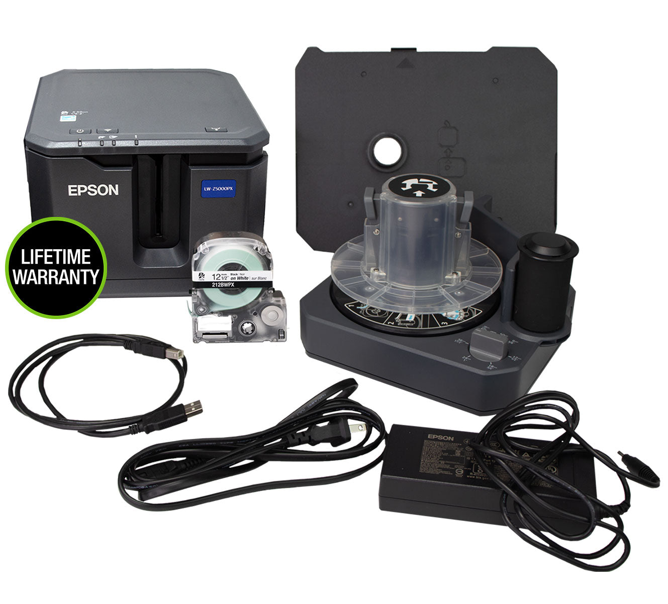 LW-Z5000PX Printer, Automatic Bulk Tape Rewinder, 1/2" Black on White Tape Cartridge, USB Cable, AC Adapter, Bulk Supply Stand, Label Editor Software Download, and Quick Start Guide