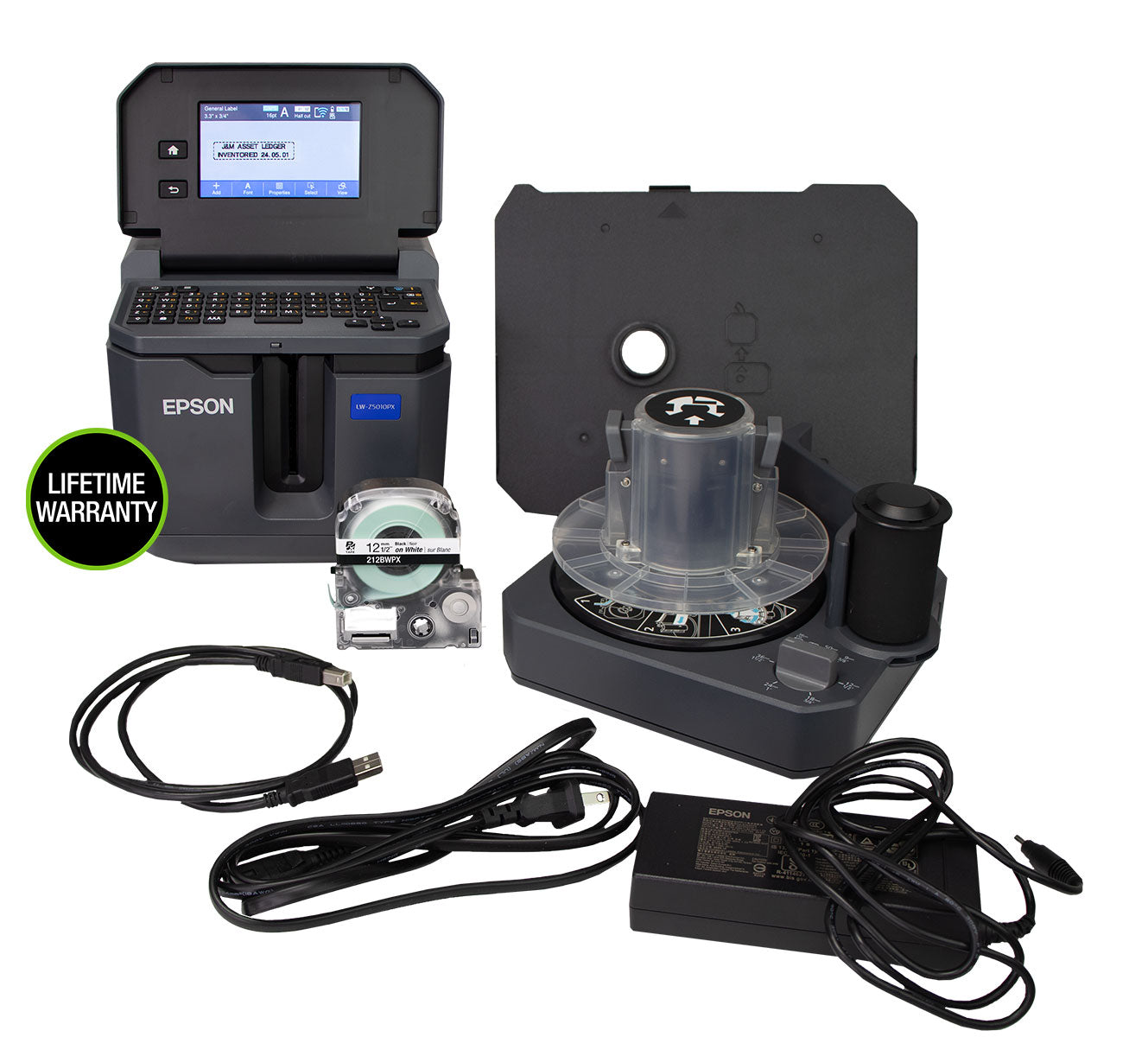 LW-Z5010PX Printer, AutomaticBulk Tape Rewinder, 1/2" Black on White Tape Cartridge, USB Cable, AC Adapter, Bulk Supply Stand, Lithium-Ion Battery, Label Editor Software Download, and Quick Start Guide